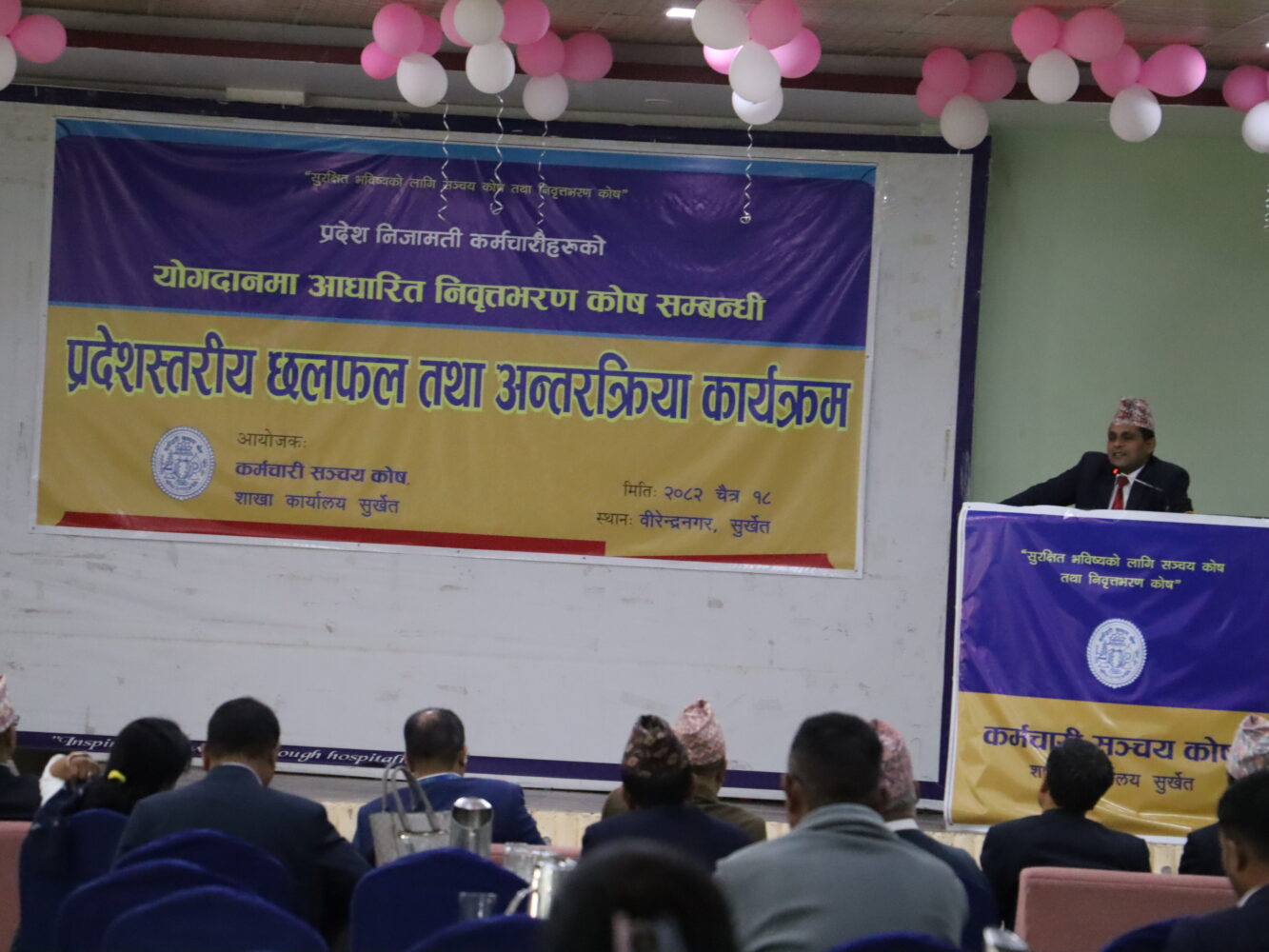 बुधबार कर्मचारी सञ्चय कोष शाखा कार्यालय सुर्खेतको आयोजनामा वीरेन्द्रनगरमा योगदानमा आधारित निवृत्तभरण योजना प्रभावकारी कार्यान्वयन विषयक प्रदेशस्तरीय छलफल तथा अन्तरक्रिया कार्यक्रम सम्पन्न भएको हो ।